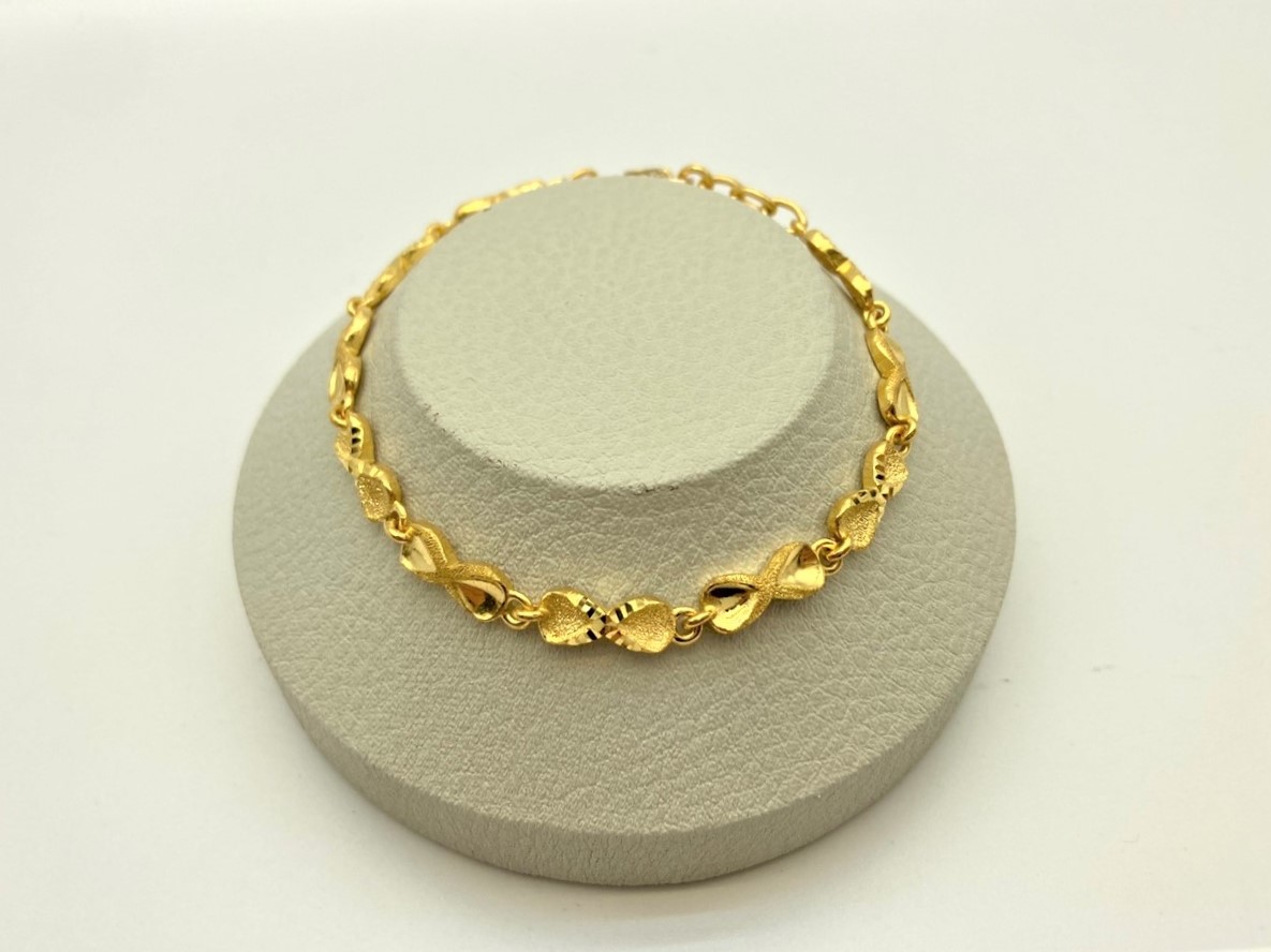 24K 순금 3돈 콤비 리본 여성 팔찌라는 제품입니다. 기성 중량 순금 3돈으로 제작된 제품이며 리본 마디 장식으로 연결디어 있는 디자인이 특징인데요? 디테일하게 컷팅이랑 따닥 스지가 패턴으로 들어가 있어서 자체적으로 고급스러운 분위기를 연출하면서 여성스러움까지 느껴지는 제품입니다.