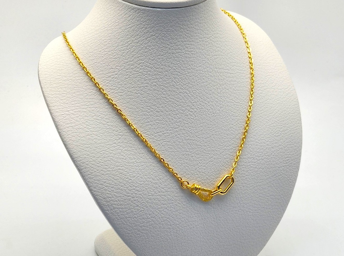 순금 목걸이를 구매 예정이셨던 고객님, 순금 제품을 좋아하시는 고객님들은 오늘 준비한 목걸이 관심있게 보셔도 좋을 거 같아요. 24K 순금 3돈 후크 목걸이라는 제품입니다. 기성 중량 순금 3돈으로 제작되었은며 별도 중량으로도 제작이 가능합니다.